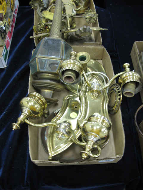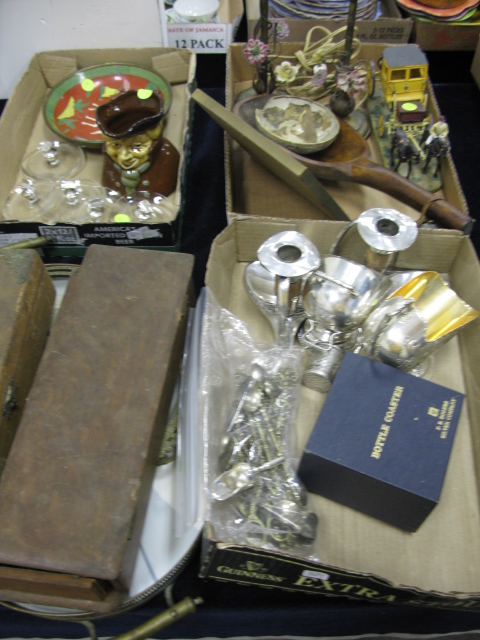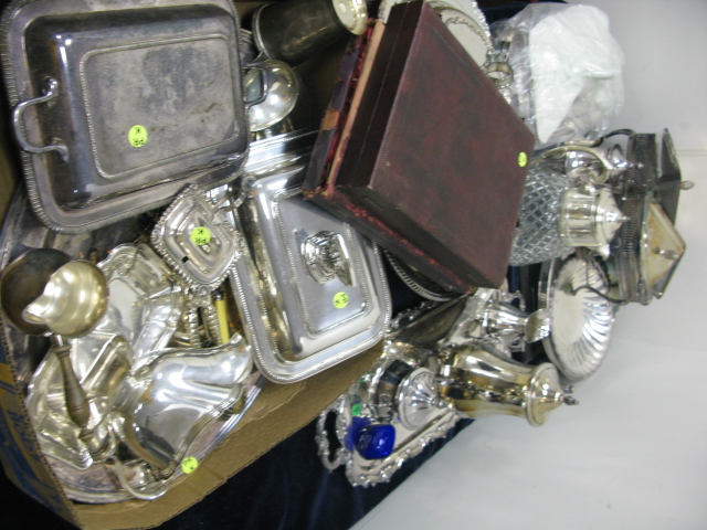 Three box lots cigerette ashtrays, pair of budoir lamps, group of silver plated items, serving tray and glove boxes.