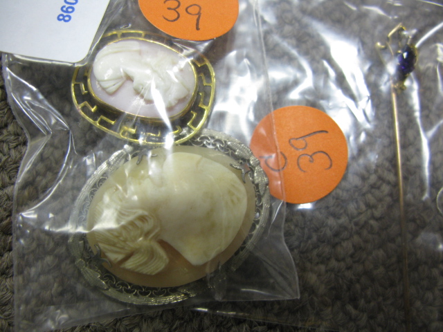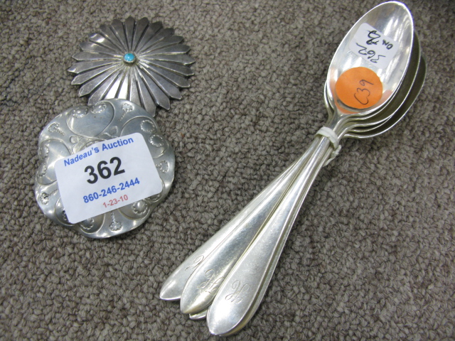 Group lot 6 sterling silver teaspoons, silver pin, pewter pin.