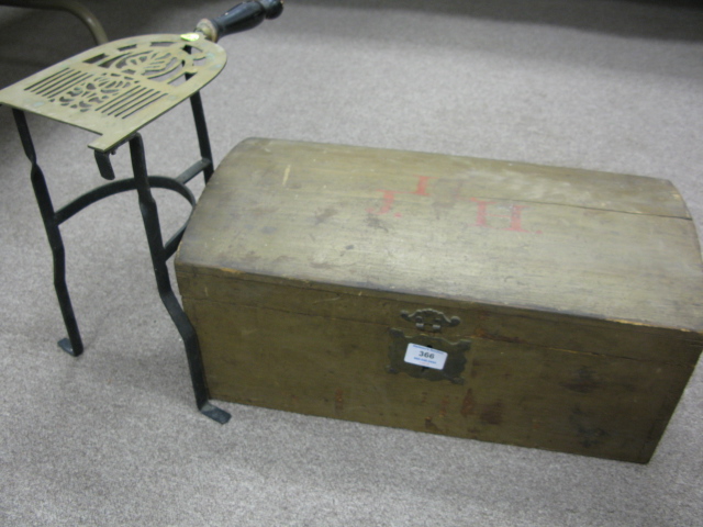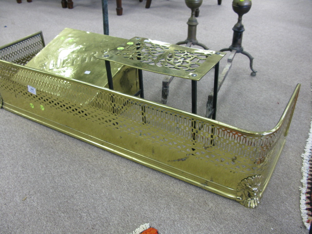 Brass fire fender, brass slipper box and brass stand with iron base.