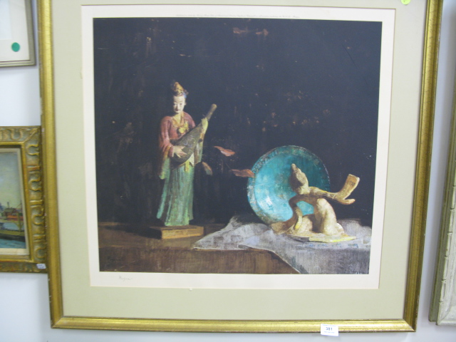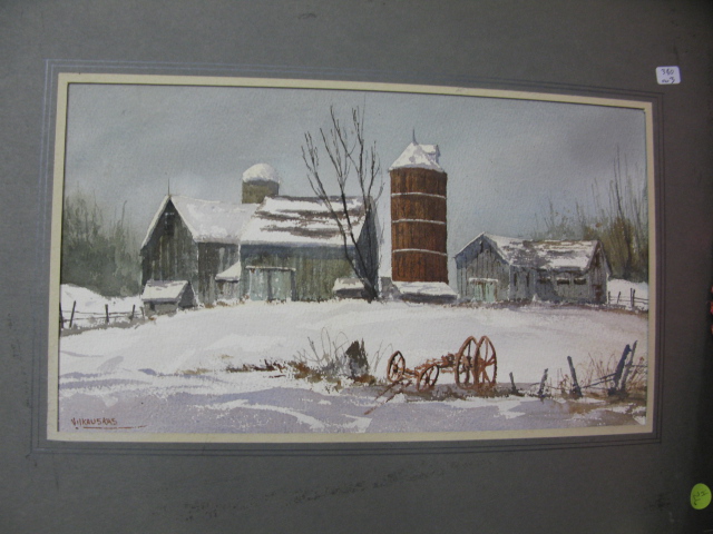 Four pieces small painting of harbor scene, watercolor winter scene and 2 prints.