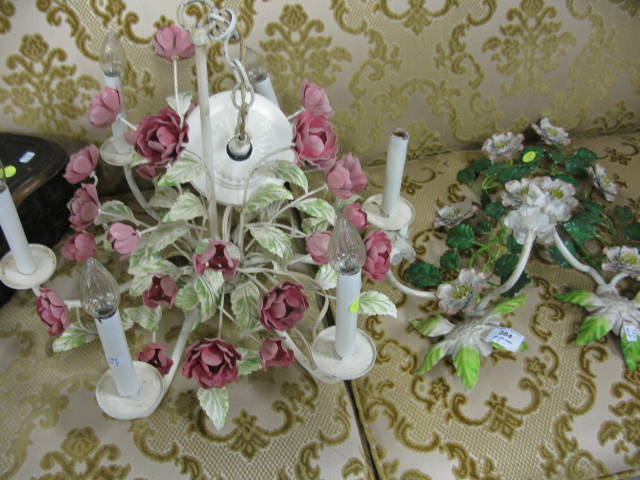 Three piece metalware lot pair of candle sconces and 6 light chandelier and shaped Oriental box.