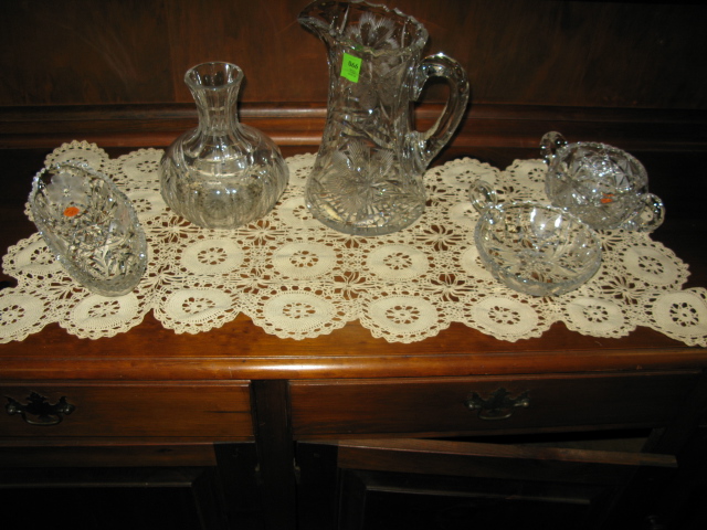 Five piece lot of cut glass, including a water pitcher, a small dish, celery dish, sugar bowl and carafe, each with butterflies and flowers.