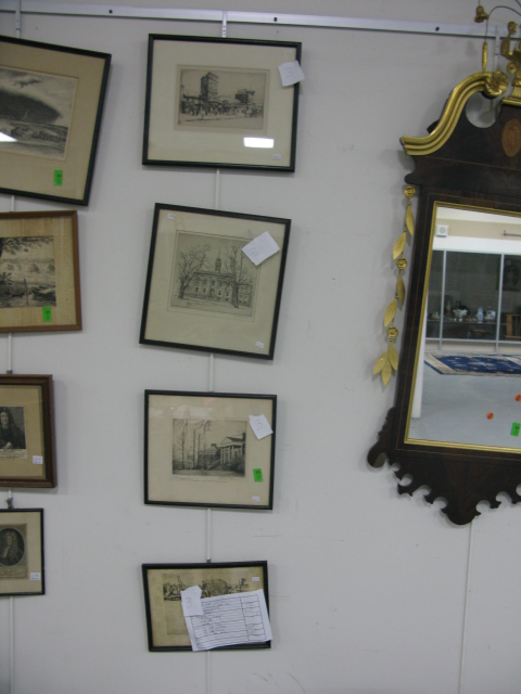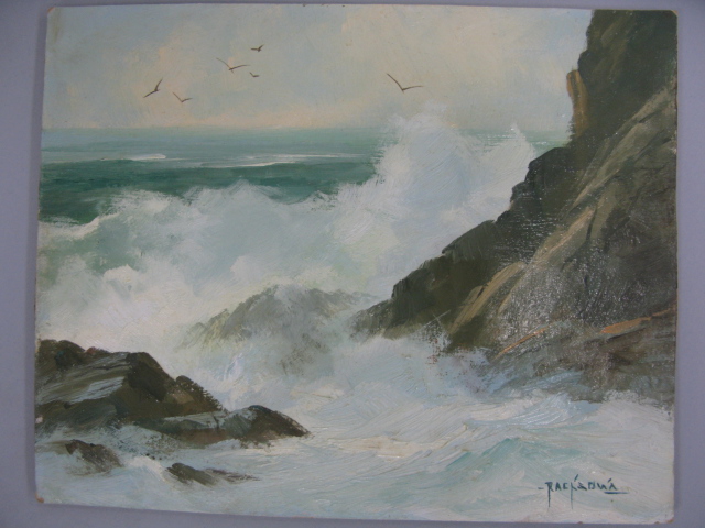 Racksona oil on board ocean shoreline, small computer desk with a large mirror and folding tables.