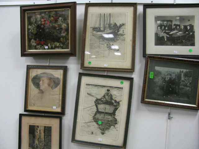 Three piece lot to include an etching of haystacks, a row boat, and two early portraits, one Boynemyster and one Sloan.