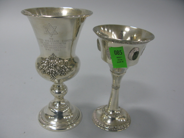 Two silver chalices, one marked sterling, one Continental, mounted with stones. One is engraved.