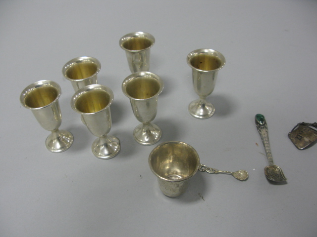 Six sterling cordials, two small spoons, a small metal and silver shot glass.