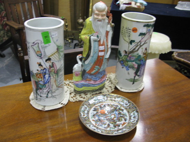 Four piece Chinese porcelain lot to include a figure, two vases, one as is, and a Chinese export plate.