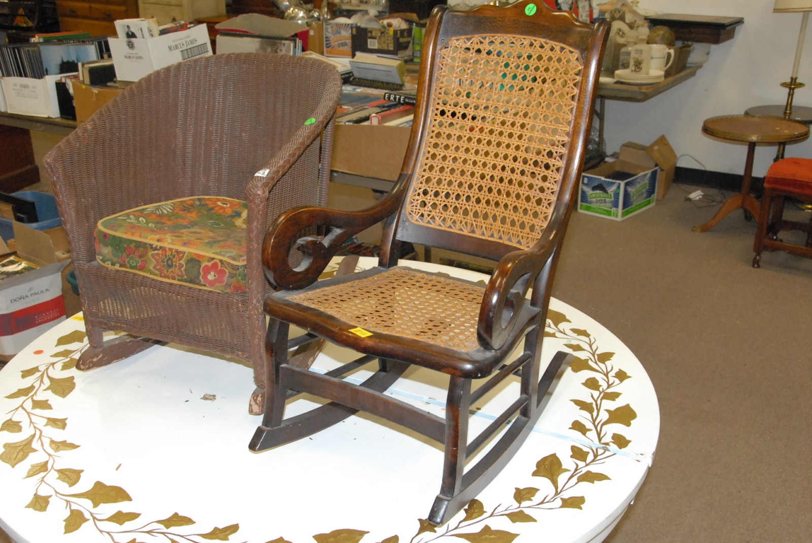 2 Children’s rockers – Wicker rocker & Victorian caned rocker