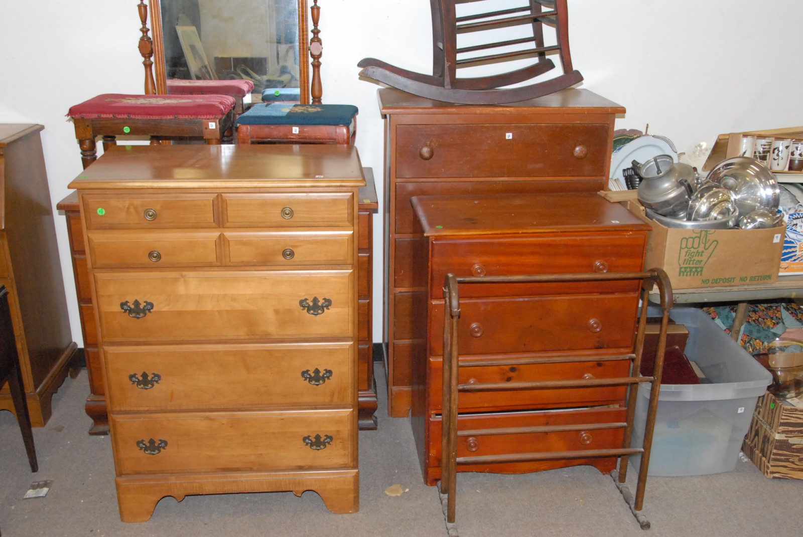 Group lot of furniture to include 4 chests, rocker, footstools, mirror & towel rack