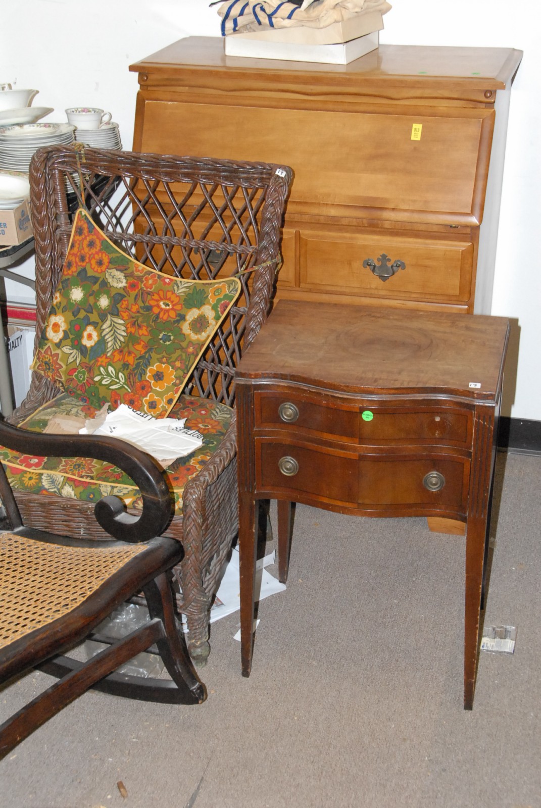 Group lot to include maple desk, wicker chair, cane chair, mahogany inlaid 2 drawer stand & breakfront