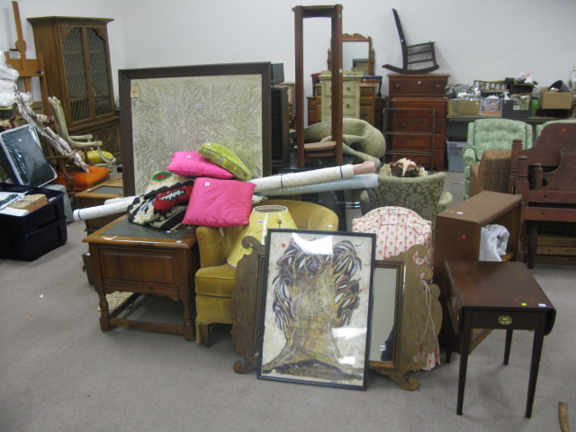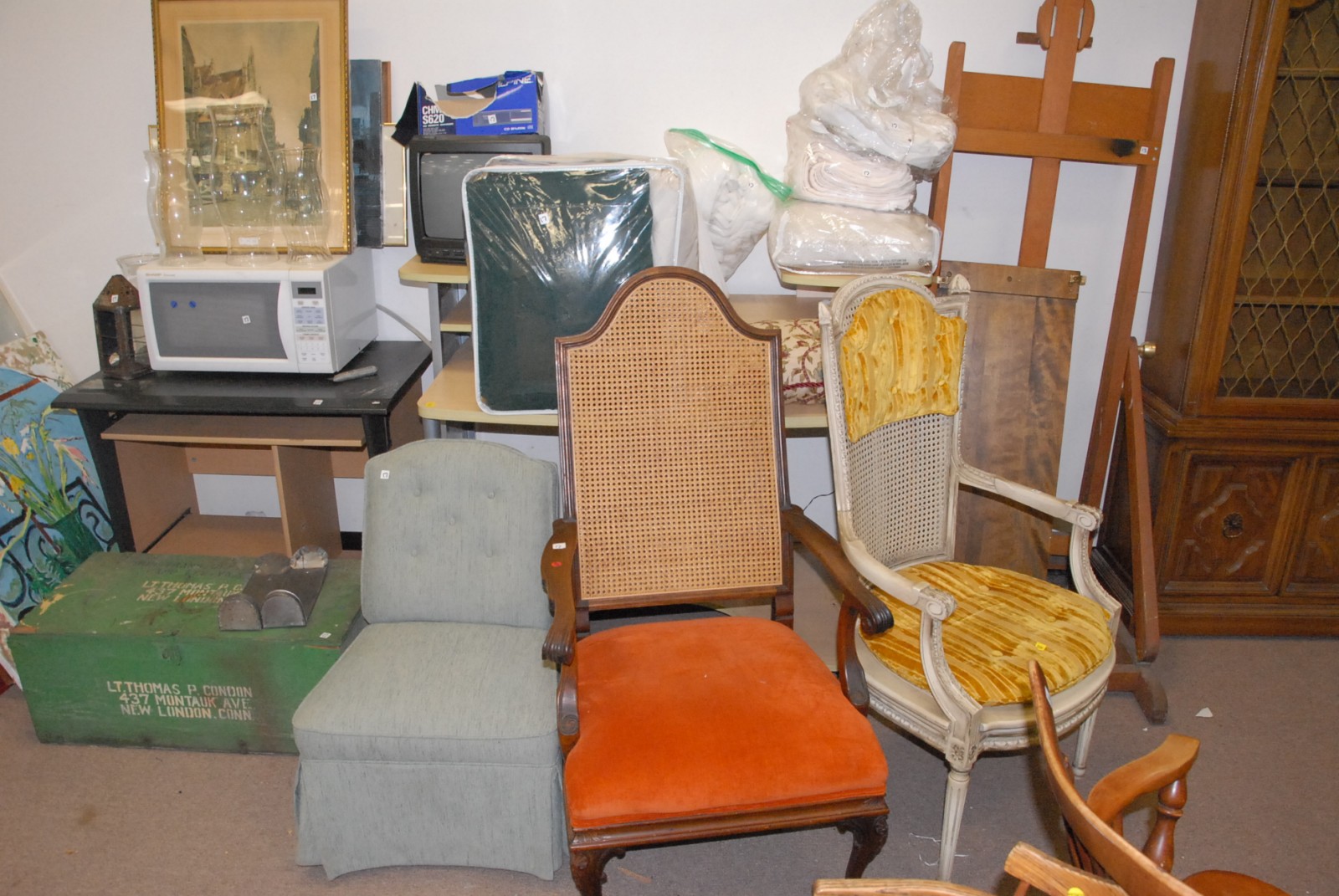 Group lot including several chairs, 2 computer desks, TV, microwave, linens, prints & paintings