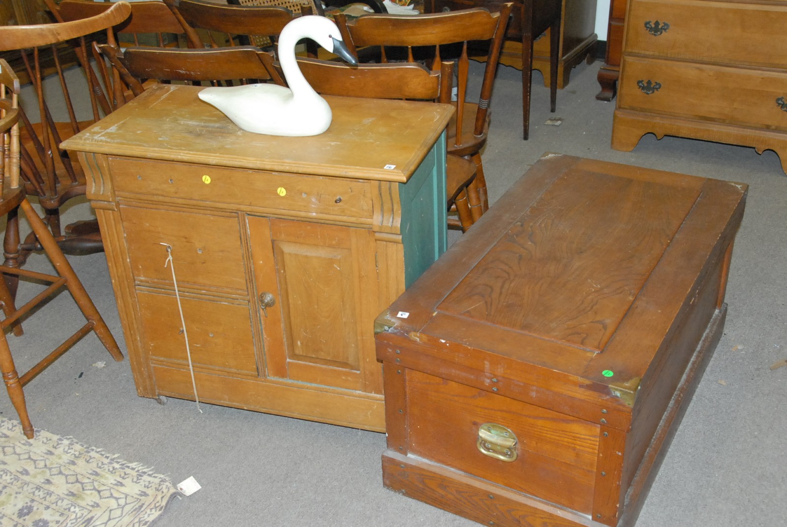 Large lot including 6 maple chairs, a youth chair, a commode, lift top oak chest & a carved swan