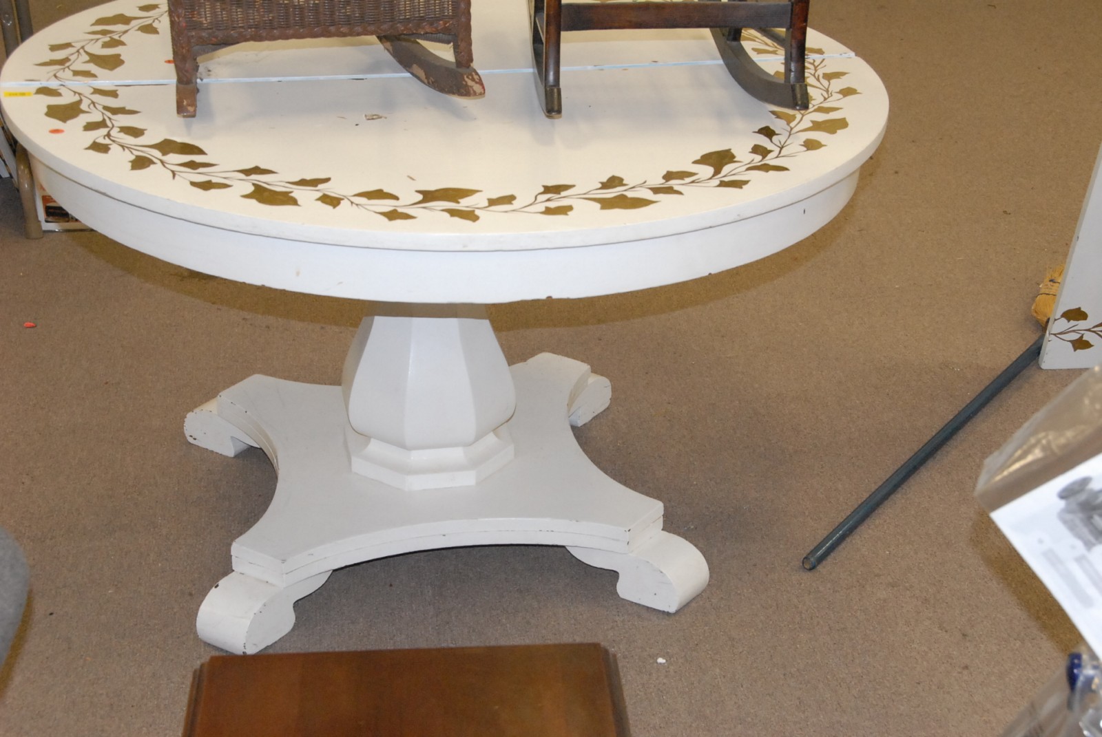 Round oak table paint decorated white with 2 leaves