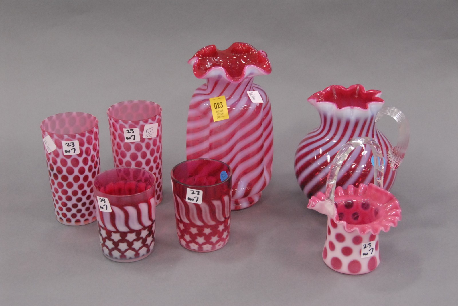 7 pc. art glass lot – cranberry swirl & cranberry dot & 2 tall tumblers with stars & stripes