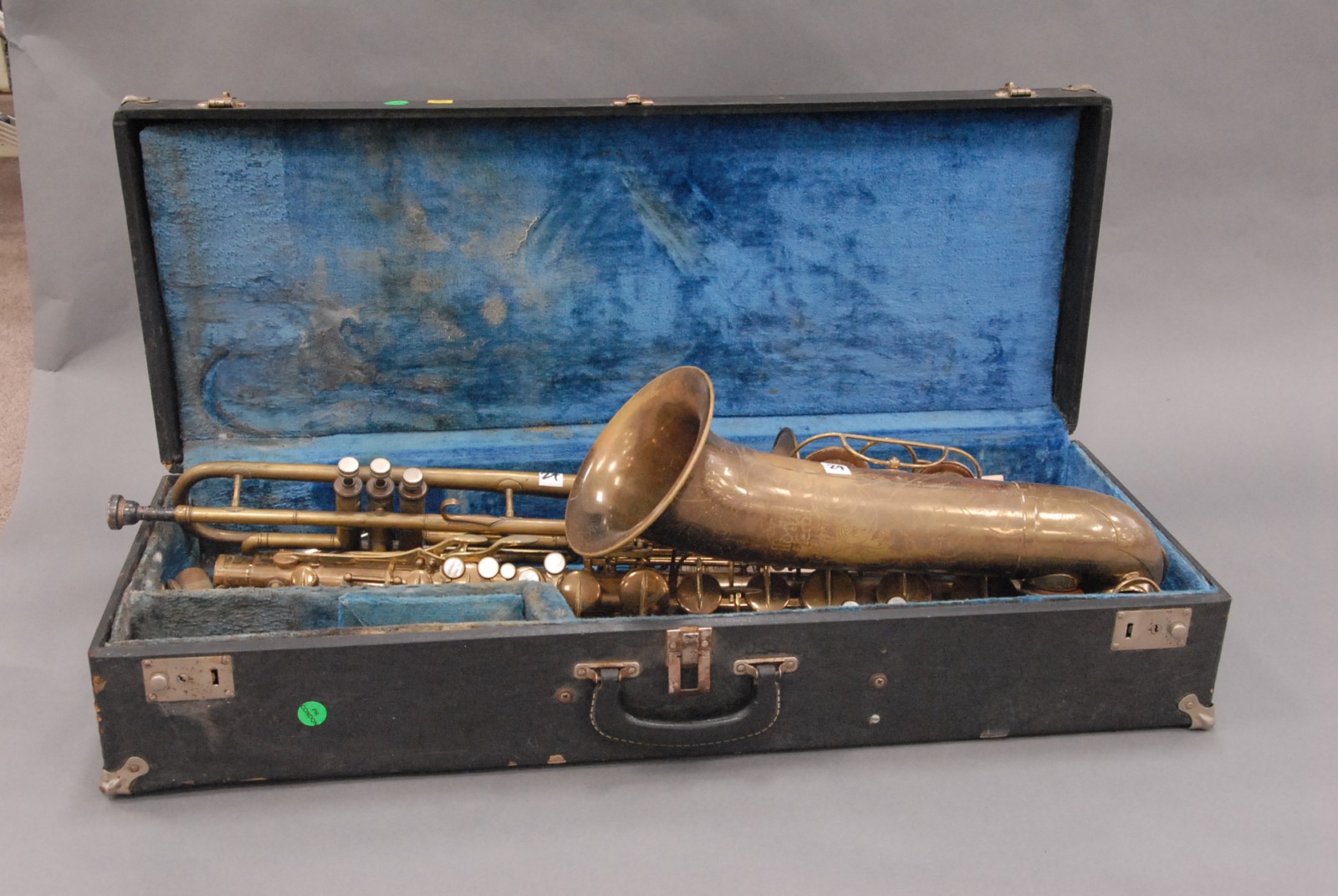 2 brass instruments, 1 saxophone marked The Martin Tenor & a trumpet