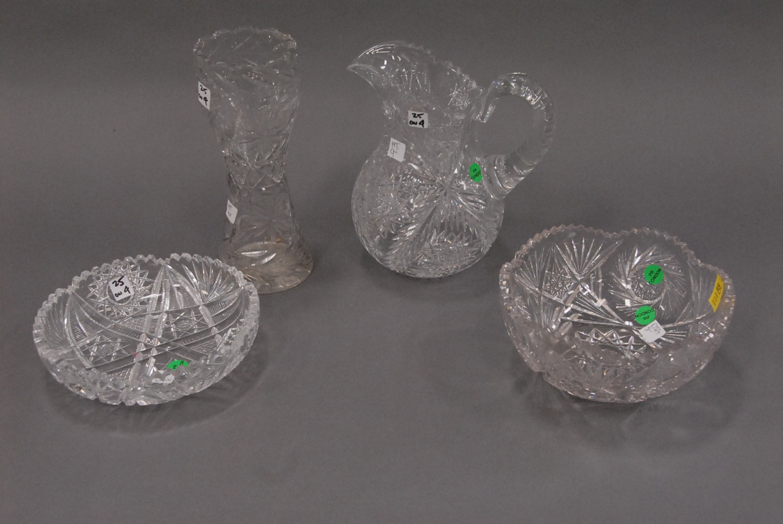 4 pc. cut glass lot – 2 bowls, a pitcher & a vase with minor chips, along with porcelain vase