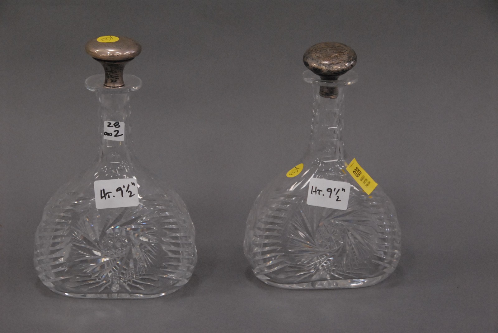 Pair of cut crystal decanters with sterling stoppers – 1 stopper as is