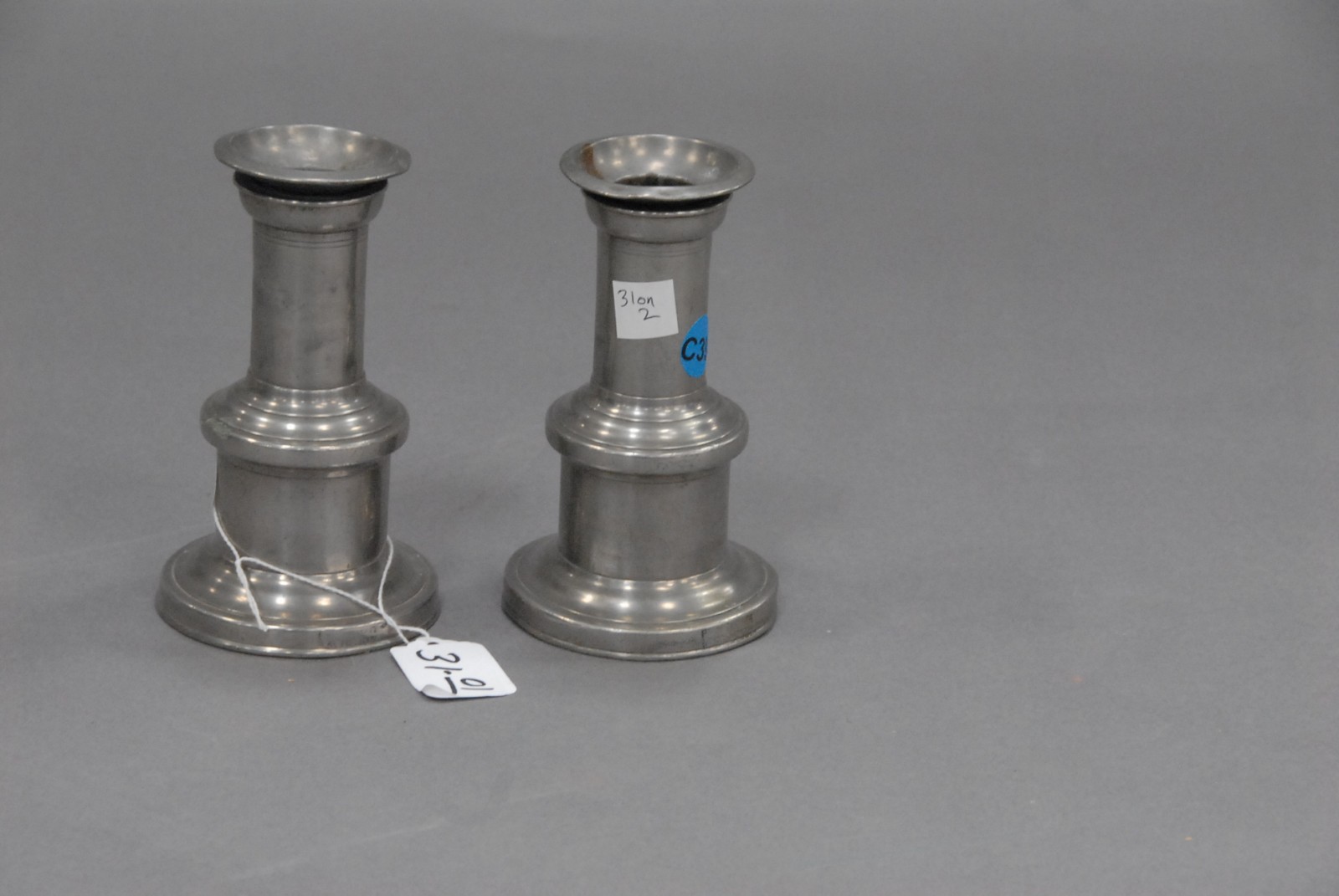 Pair of primitive pewter candlesticks with adjustable height, unmarked.