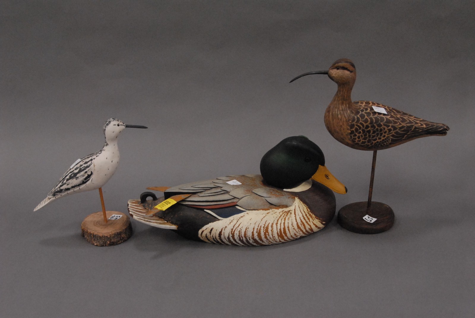 3 Decoys – a duck signed Swan Quarter K. Kulin ’83 & 2 shore bird decoys -one marked JDK to Astrid from Allen 1999