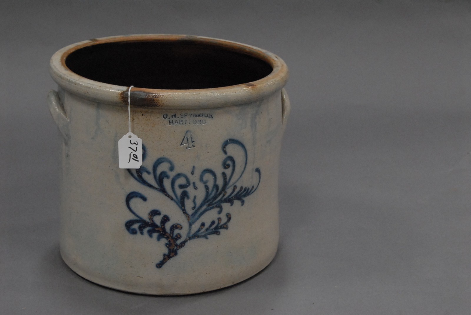 Seymour four gallon stoneware crock with blue floral decoration.