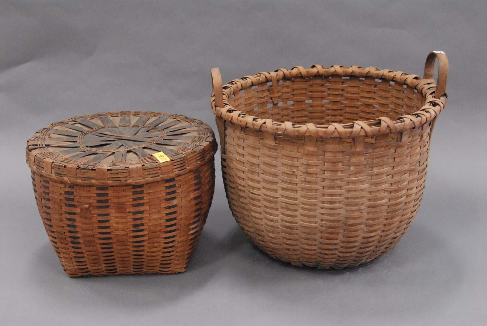 2 large baskets – a large paint decorated covered Indian basket with cloth inside, some damage & a large 2 handle basket