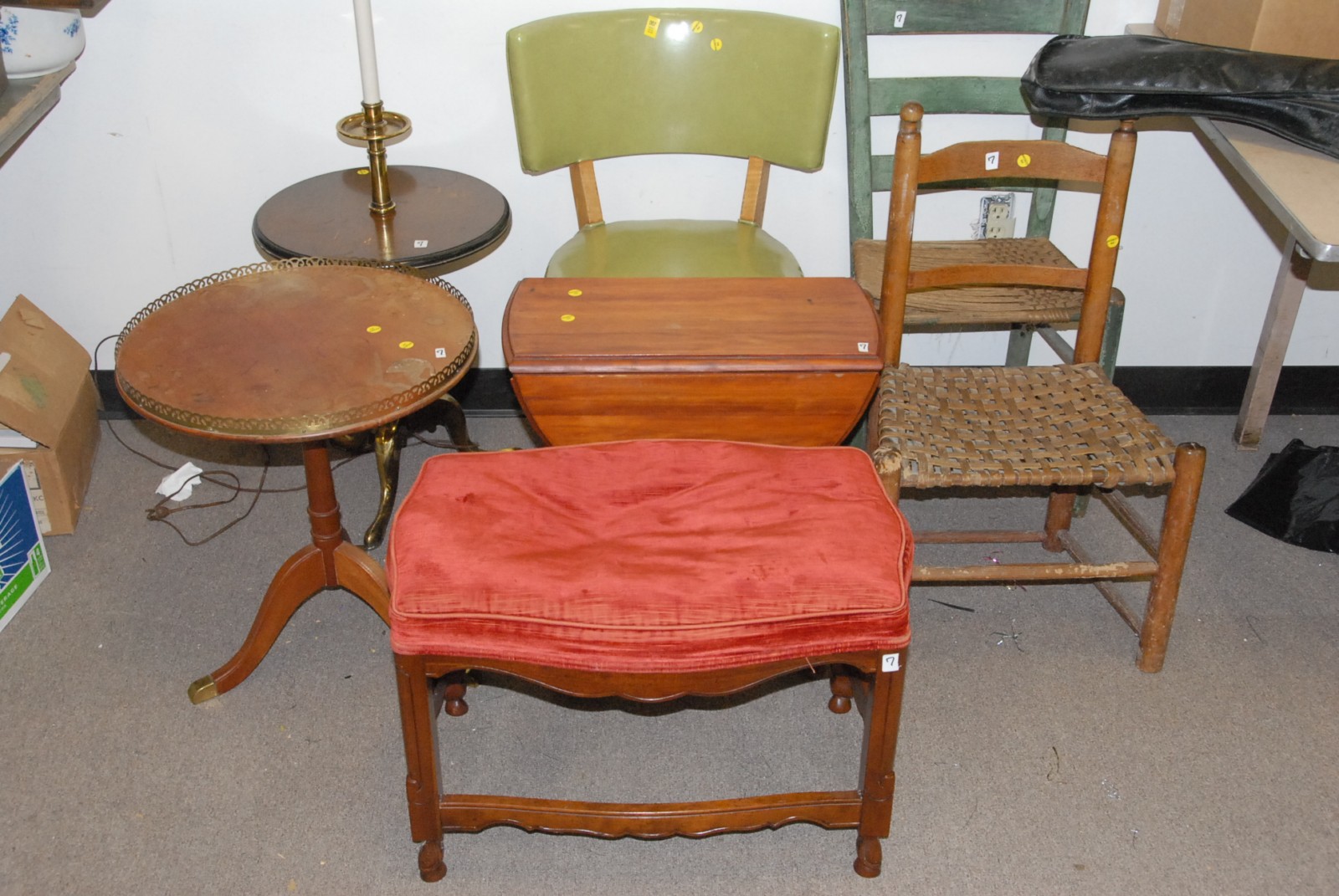 Group lot including chairs, tables, stands & a bench