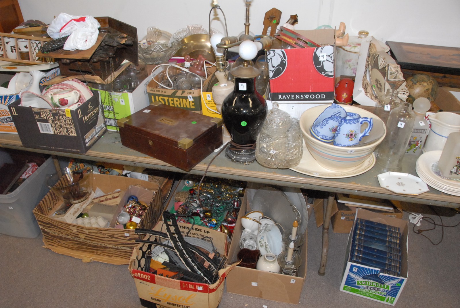 Table lot top & under table – glassware, china, books, Christmas decorations & Vintage Cuckoo clock with carved birds & weights
