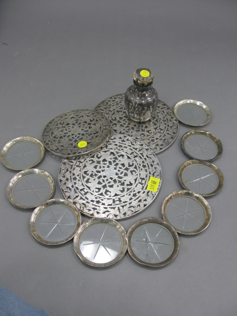 Sterling silver & glass lot including 3 pot stands & an overlay cologne bottle with stopper and several coasters with sterling rims
