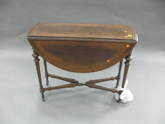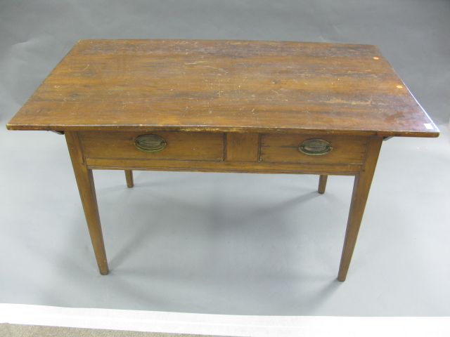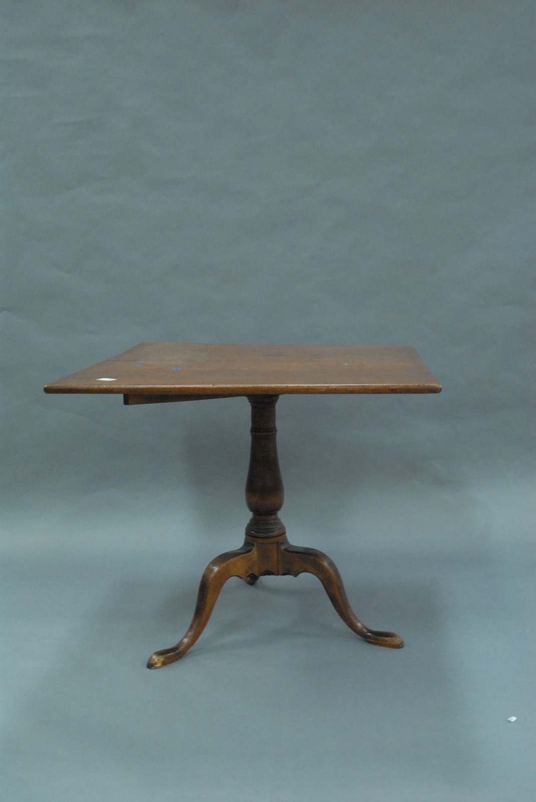 Federal square tip tea table on turned shaft with tripod base ending in snake feet.