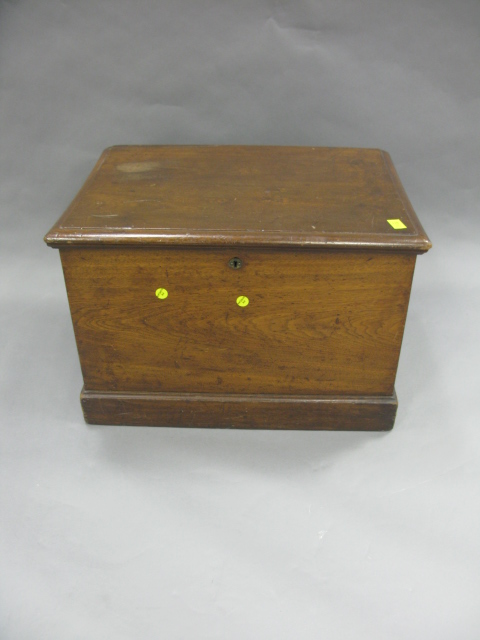 Unusual mahogany lift top box with 3 wooden slides inside & brass handles
