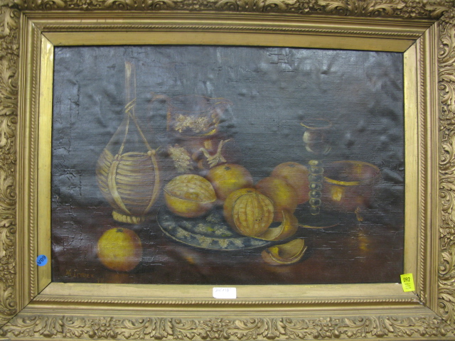 Victorian oil on canvas still life of food and dishes on a table signed lower right M. Green