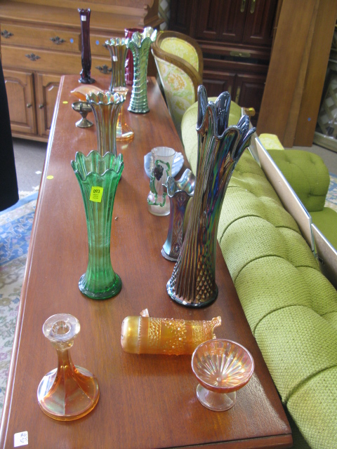 15 pc. lot including carnival glass, vases, candlesticks, small dish, & weighted sterling silver sugar & creamer, etc.