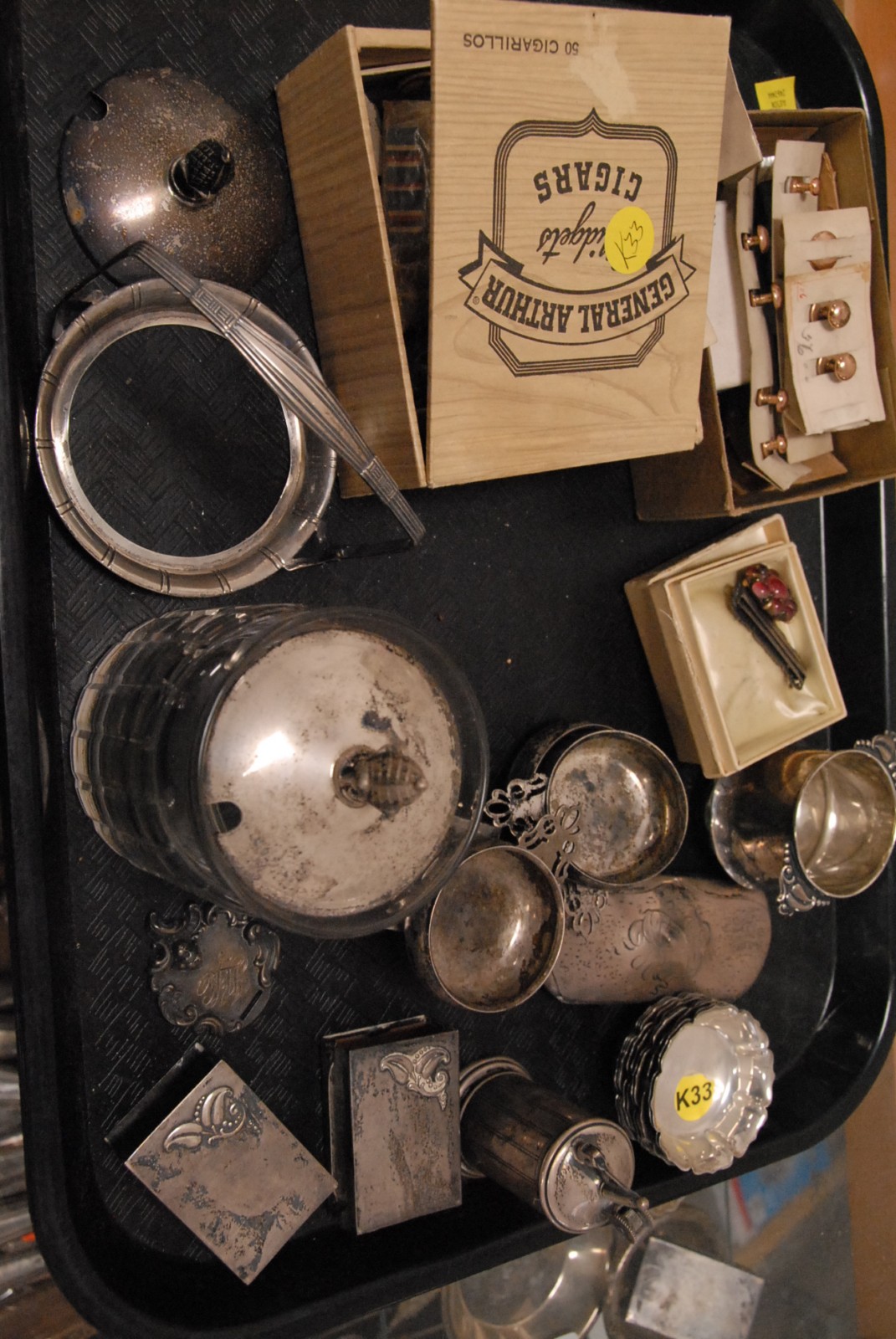 Tray lot to include sterling silver, Victorian buttons and pins on original cards, 2 match safes and mother of pearl book binder