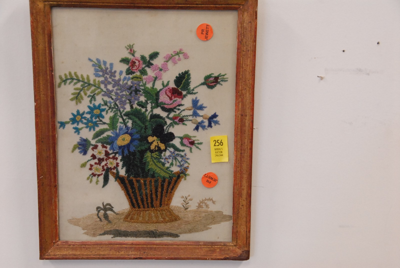 Framed beadwork basket of flowers in silk, hand done
