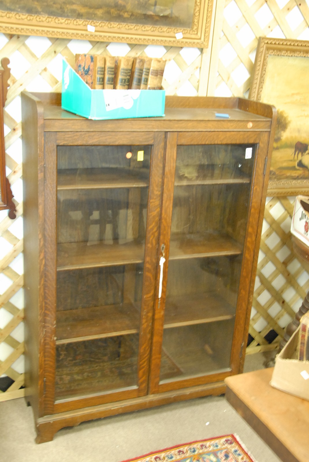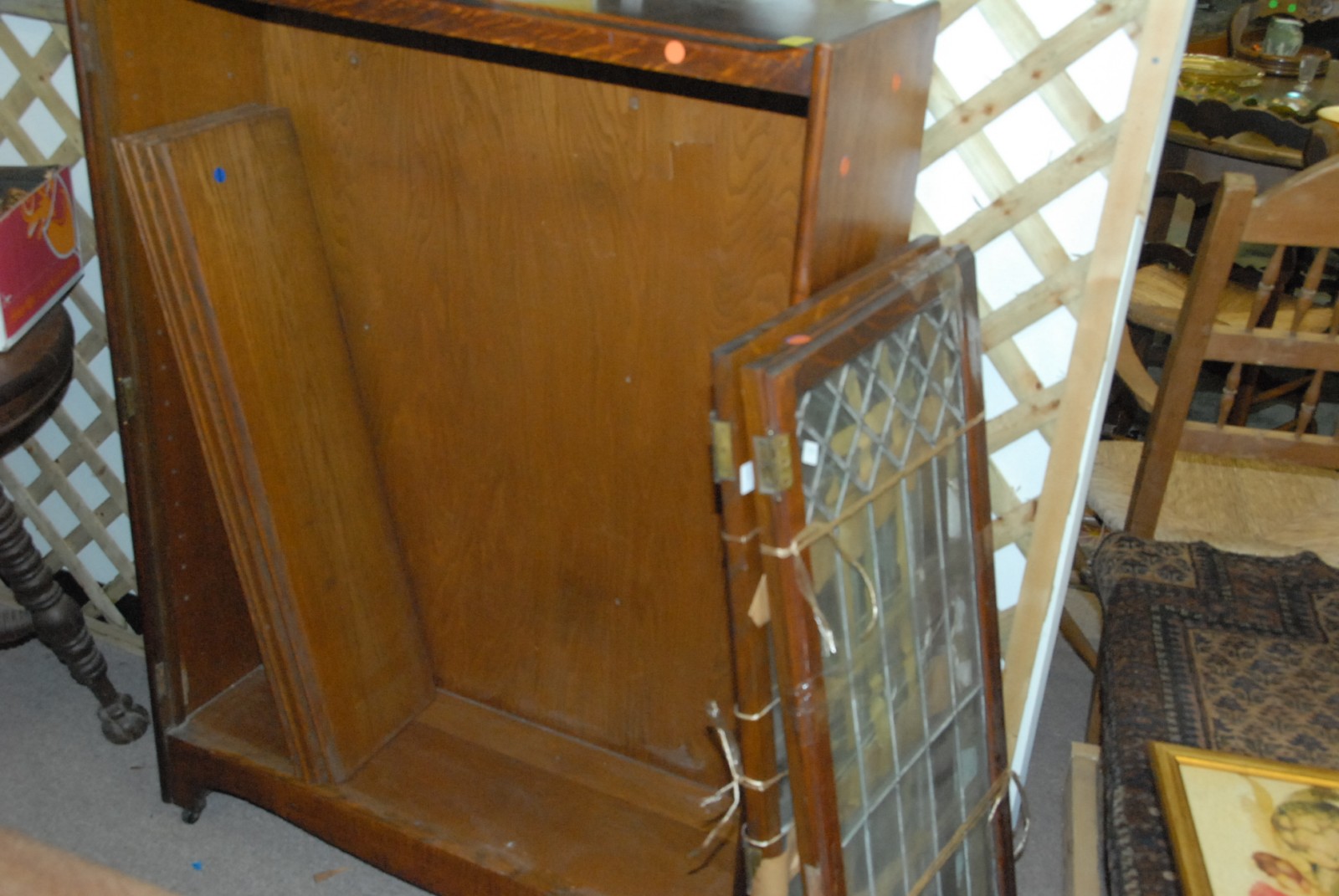 Oak Victorian bookcase with leaded glass doors, one door as is