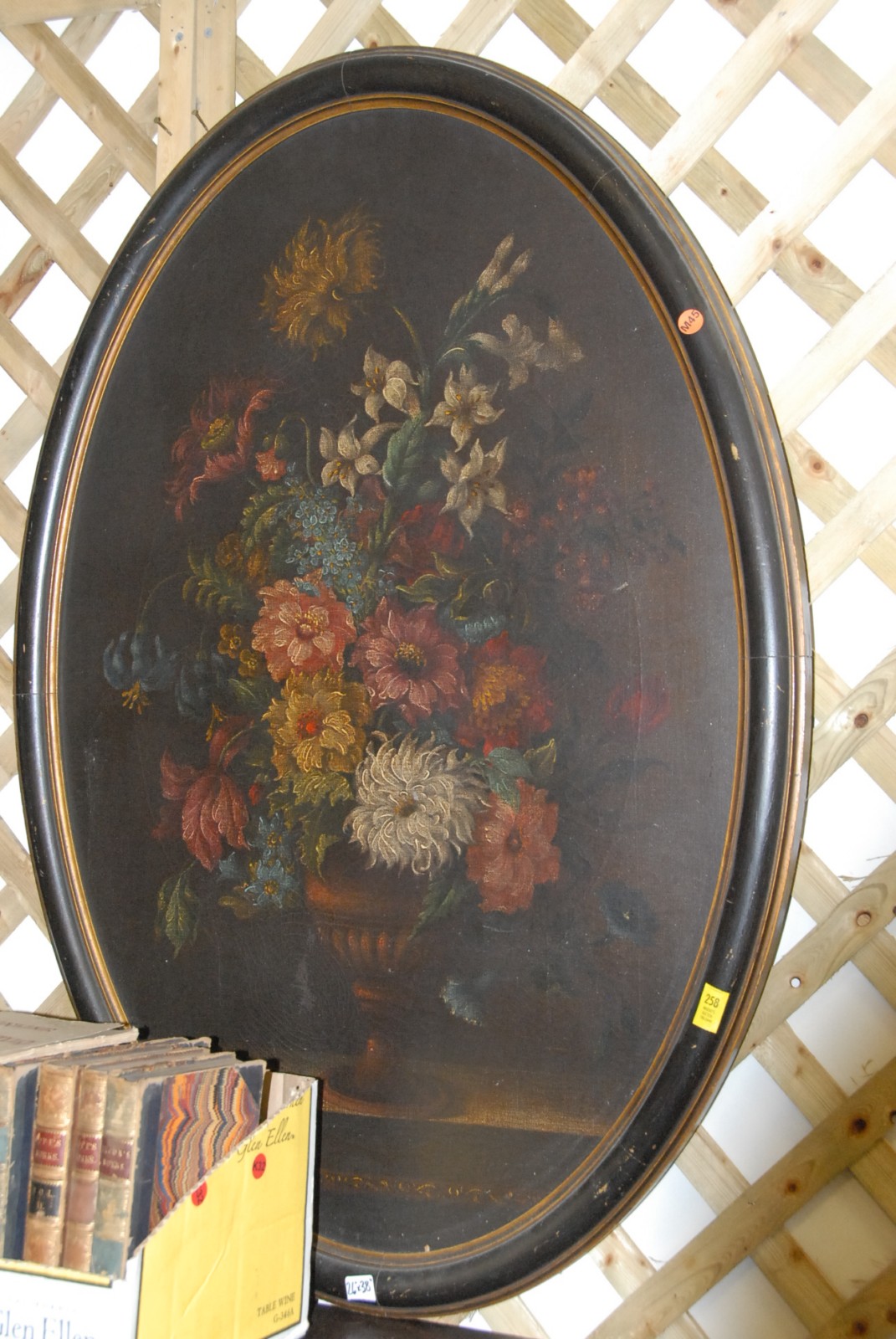 Large oval oil on canvas still life of flowers
