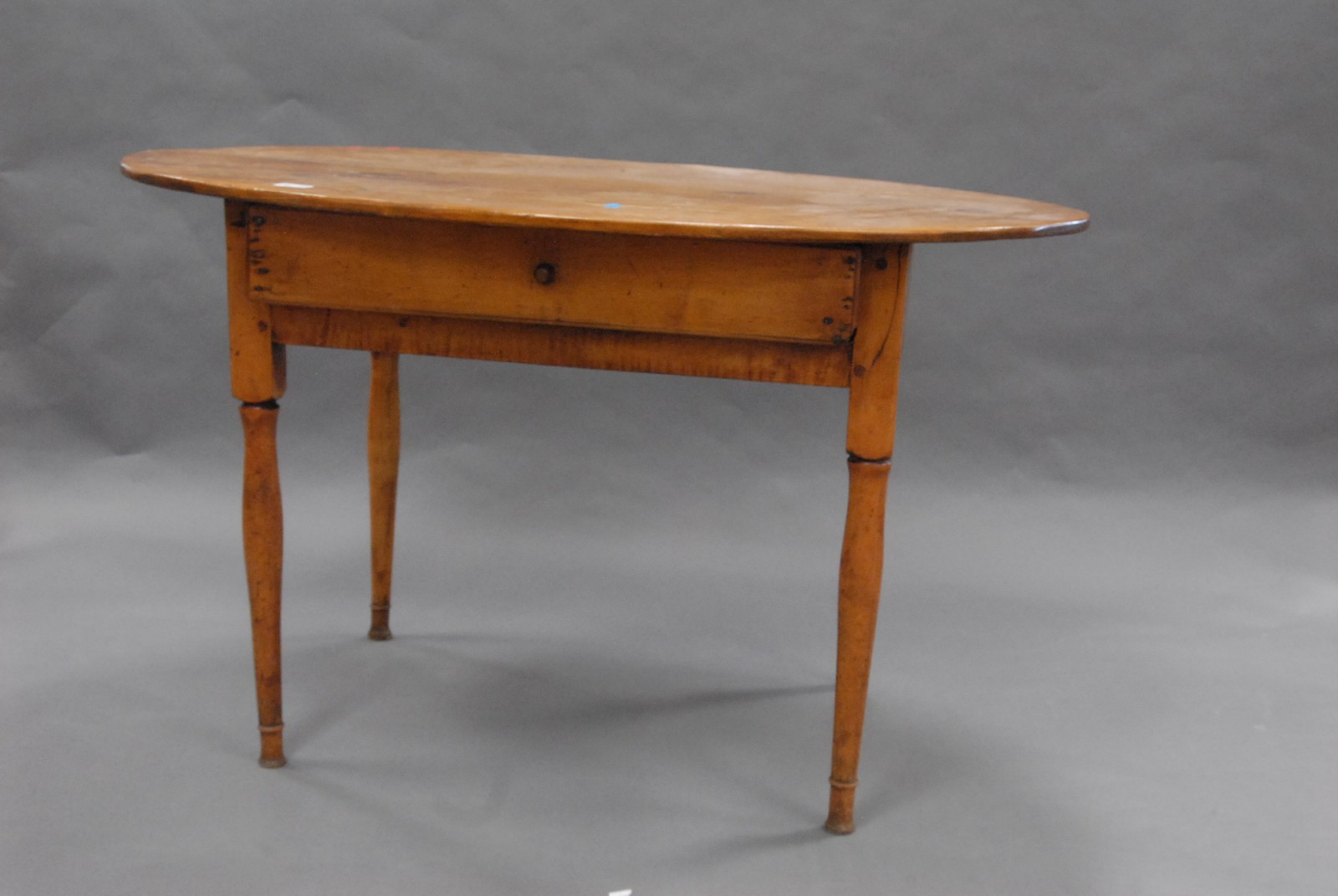 Queen Anne center work table with drawer and oval top on turned legs having button feet, circa 1740. Provenance: Lyme Connecticut Collection.