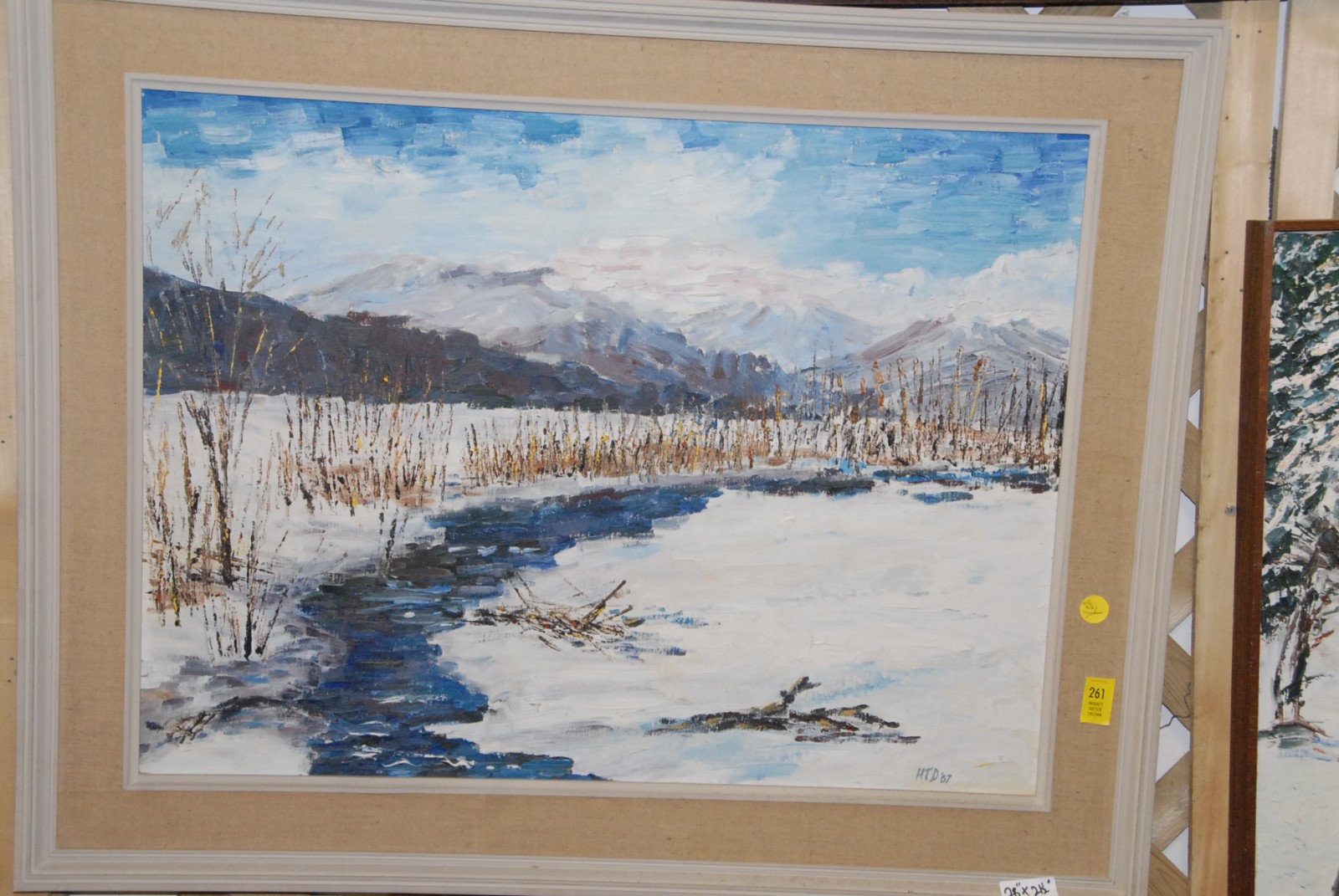 2 oil on canvas winter scenes, one of skiers, one of river and landscape
