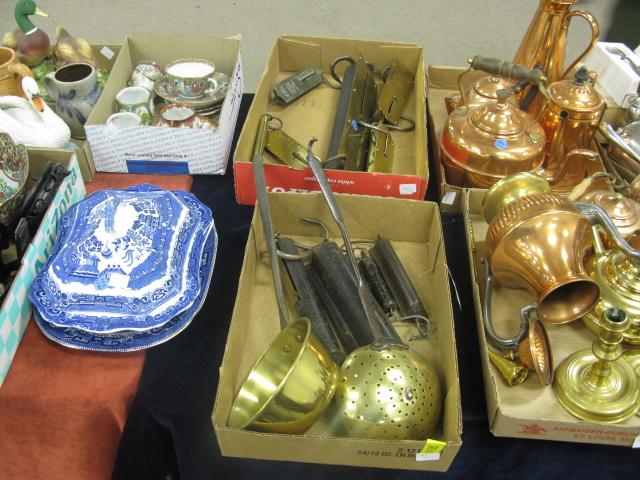 2 box lots of brass including 10 early brass scales, scoop and a strainer