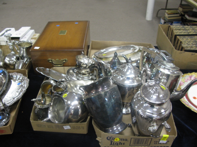 3 box lots of silver plated items, including teapot, gravy boat, trays, and misc items, storage chest for silver