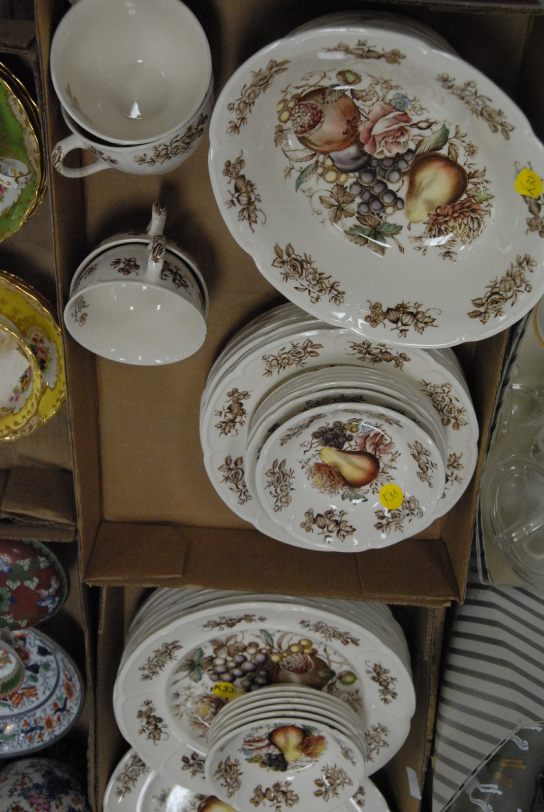 4 box lots including a partial set of Johnson Brothers china, Minton cups and saucers, Oriental jar with a cover, Wedgwood cloisonn, couple porcelain pieces
