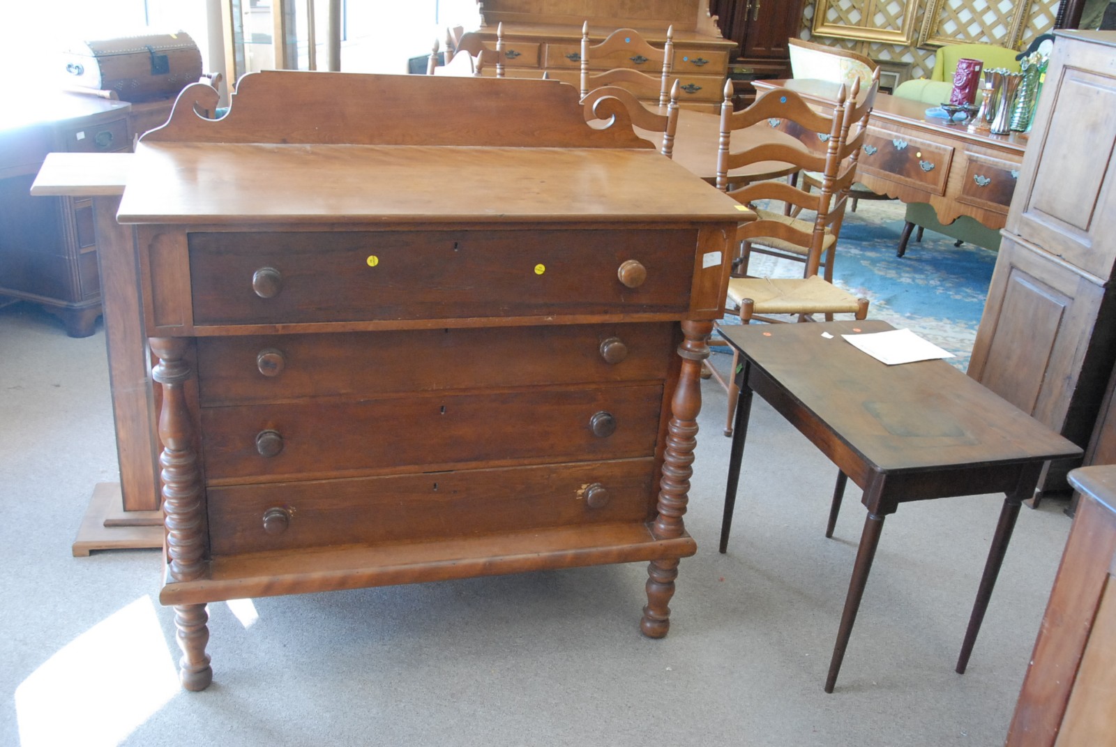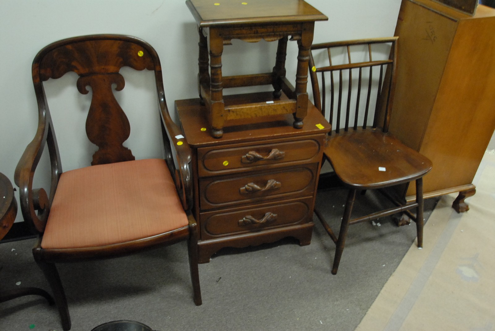 4 piece lot to include a joint stool, 2 chairs, and a small 3 drawer chest