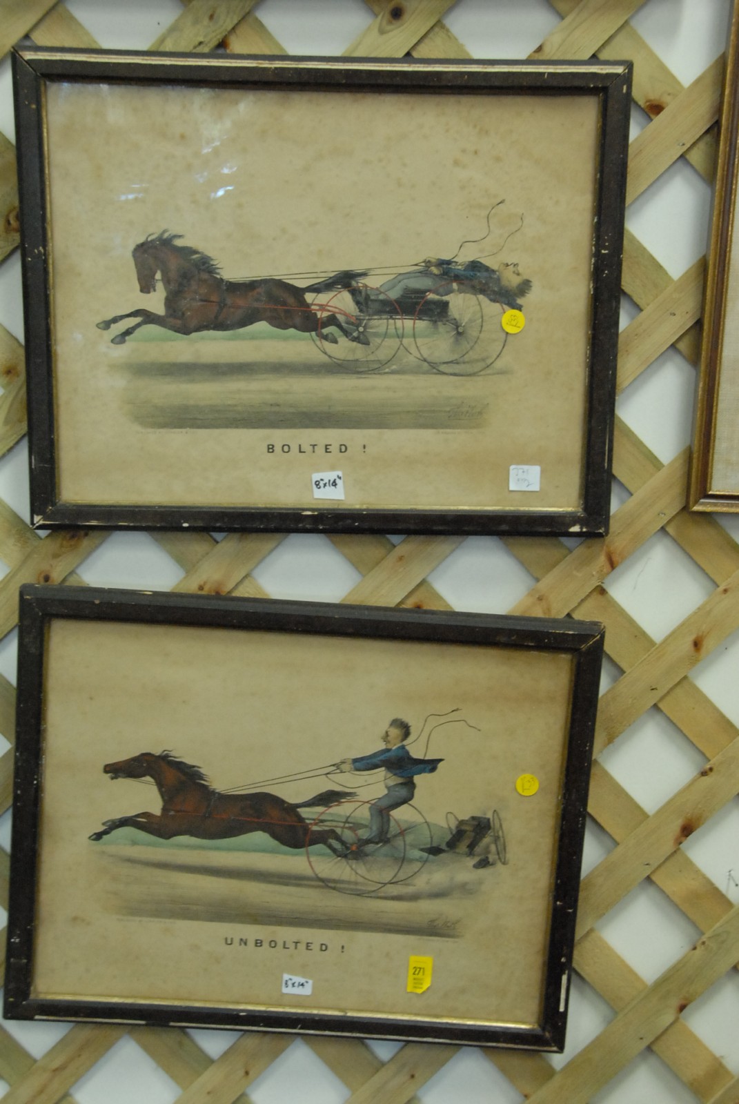 2 Currier and Ives prints titled Bolted and Unbolted