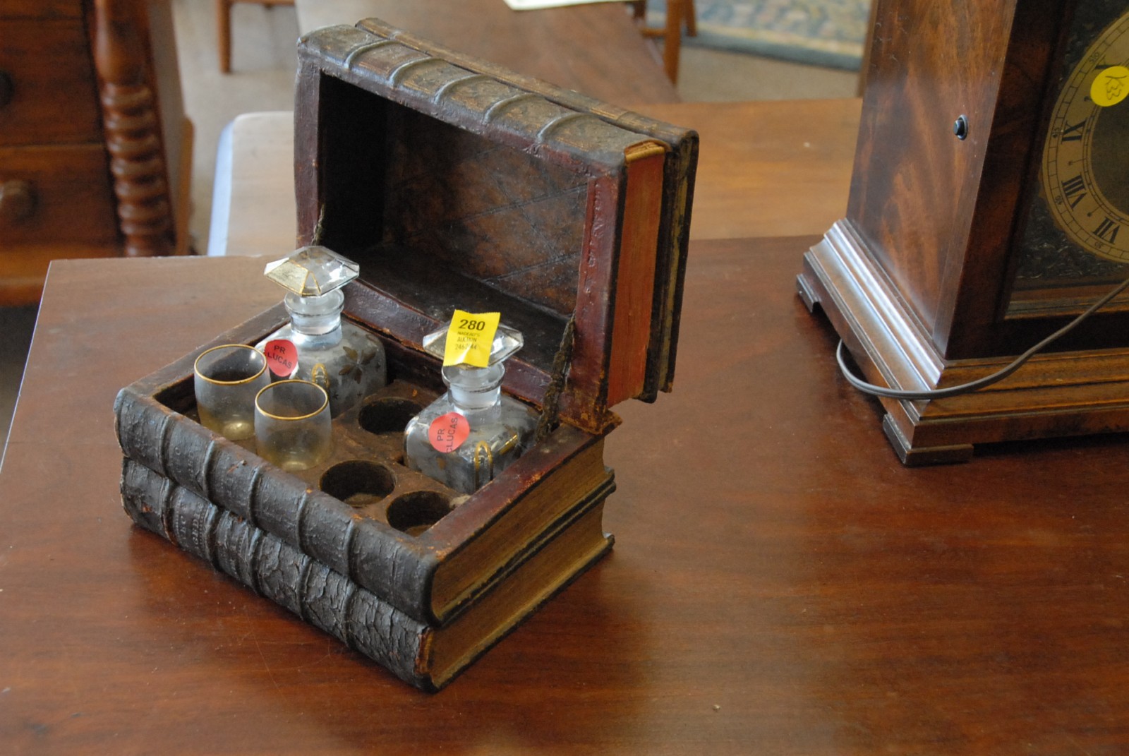 Leather book cellaret with 2 decanters and 2 shot glasses, 3 pieces missing, top loose