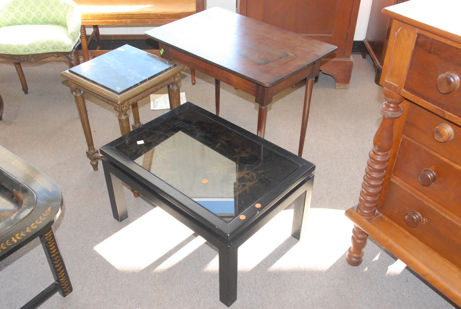 3 piece lot, small marble top stand, a turn leg table in a black and glass table