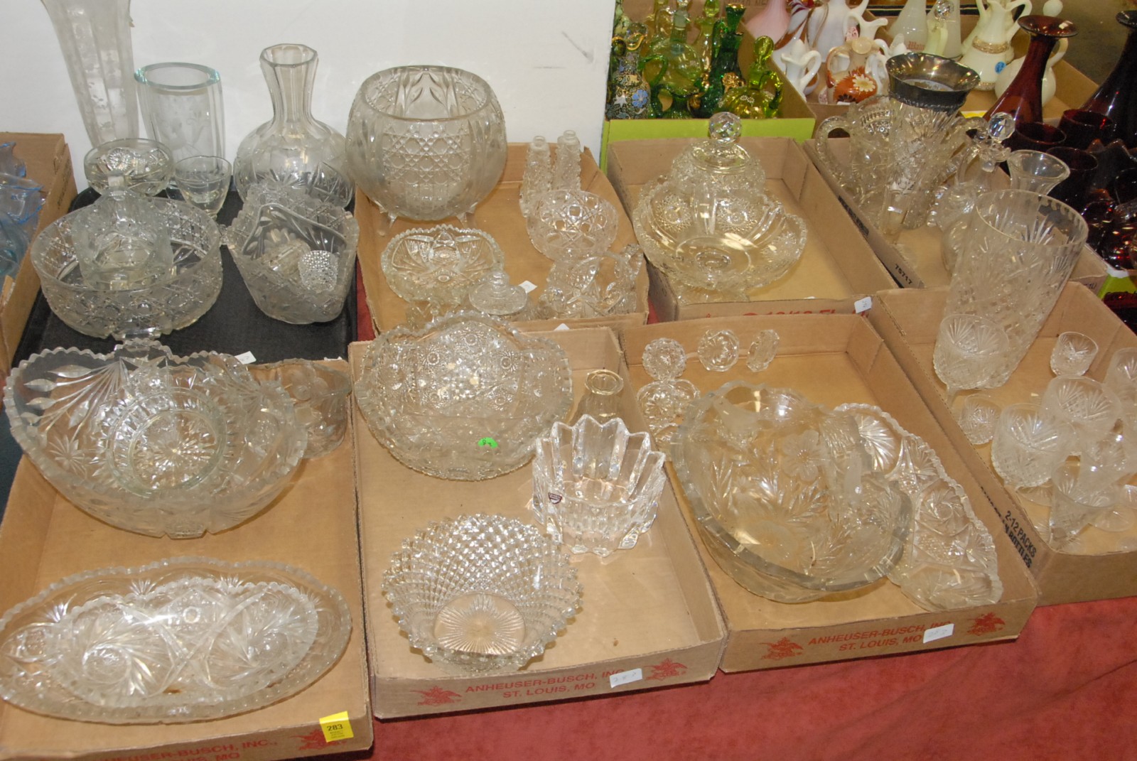 10 box lots including cut glass, press glass, ruby glass, cut glass butter dish, cut glass vase as is, cut glass bowls, stems, decanter, vases, etc