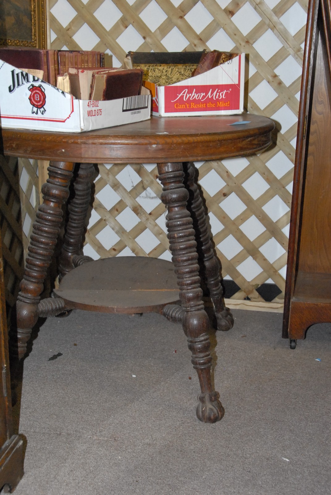 2 Oak Victorian occasional tables each with claw feet one with a shelf cracked