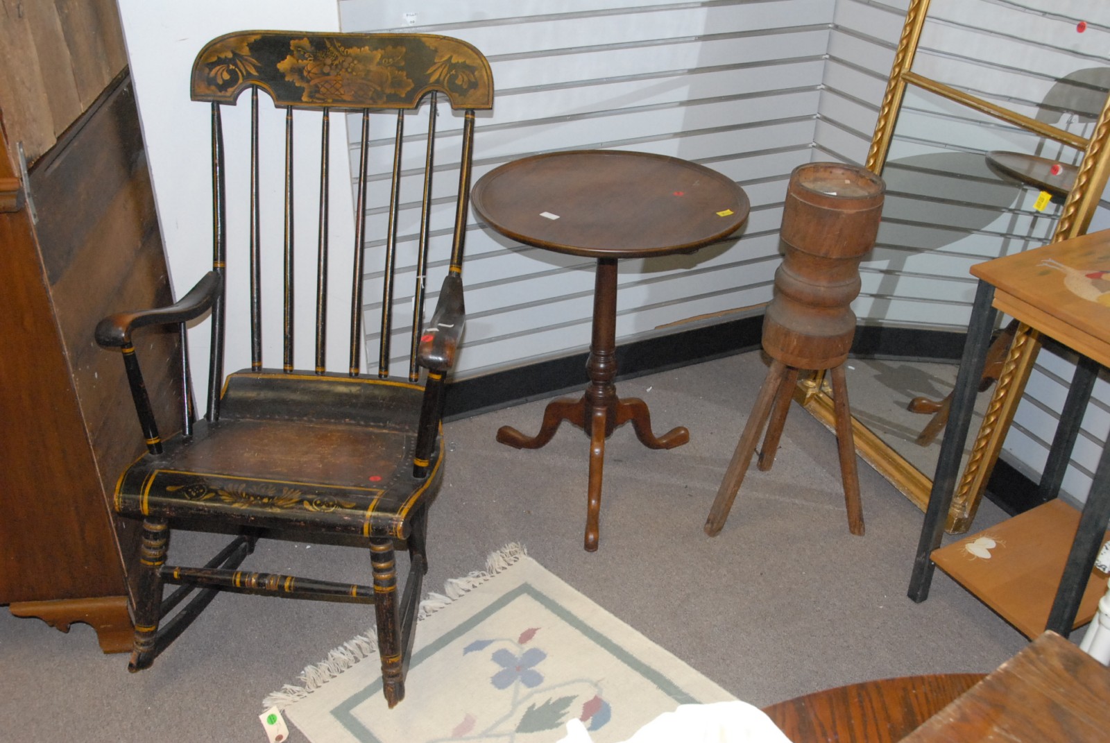 3 piece lot is a turned wooden mortar type piece on legs, mahogany candlestands, and a Salem rocker