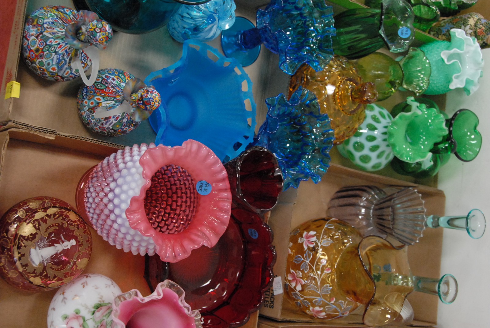4 box lots of art glass to include enameled decorated picture, cranberry pieces, cruets, vases, candlesticks, blue picture, cranberry powder box, etc.