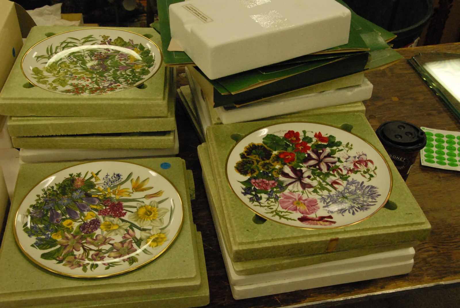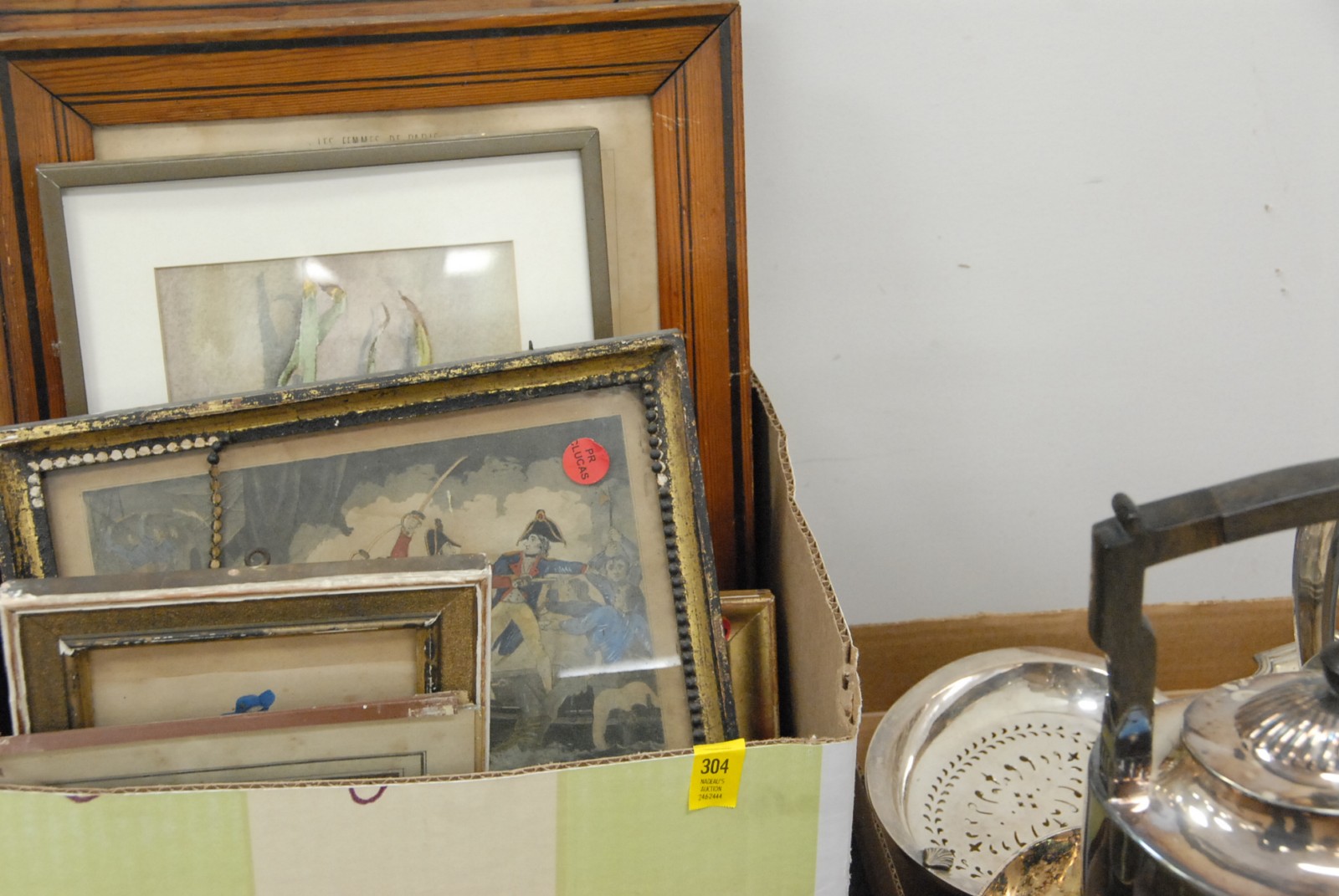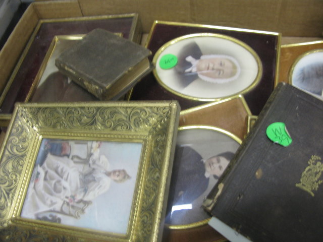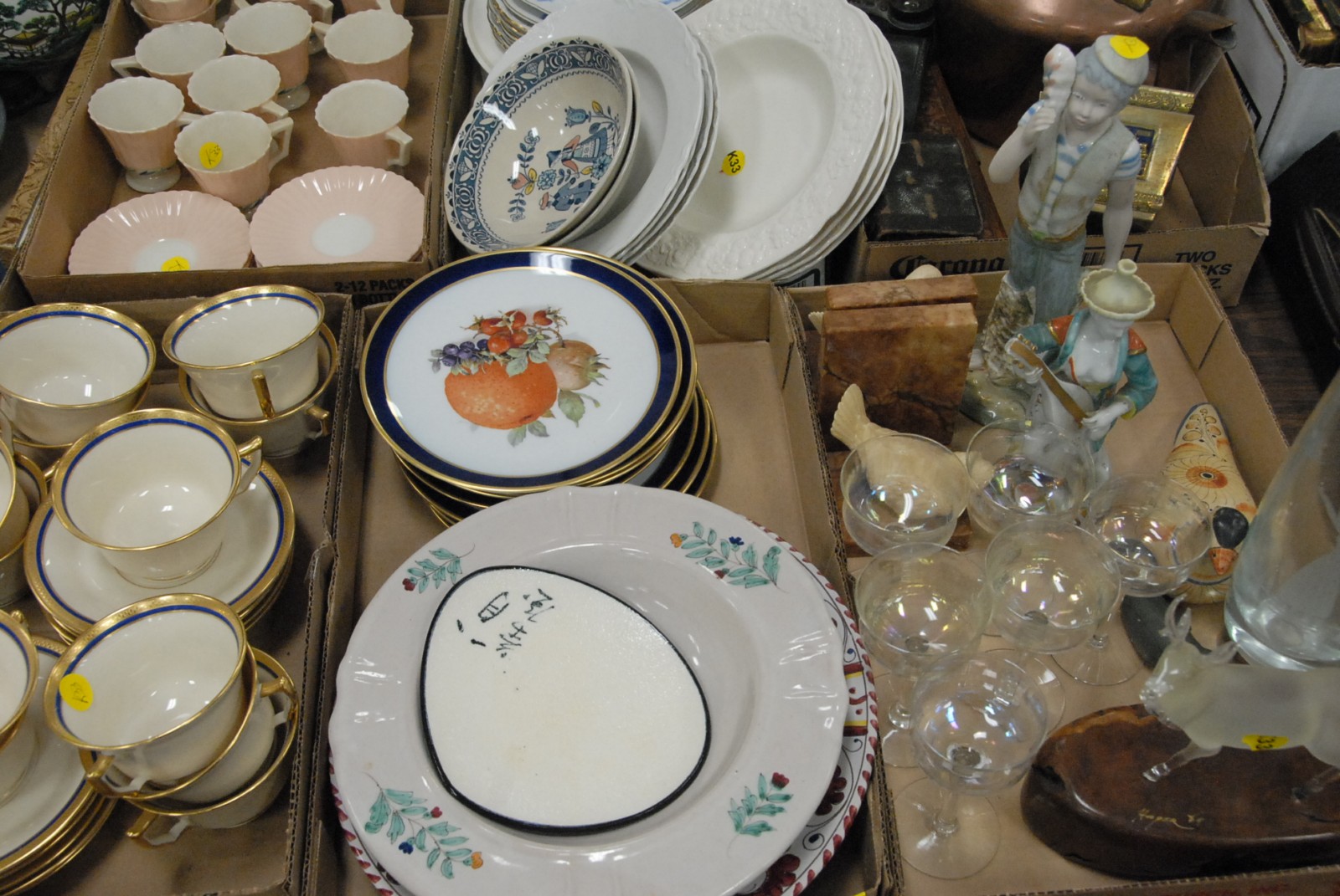 7 box lots to include dishes, plates, copper teapot, binoculars, everyday glasses, and glassware, brass enameled box and some books, The Story of The War of 1898, and a crystal deer